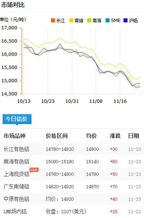 鋁錠價格今日鋁價2017-11-23