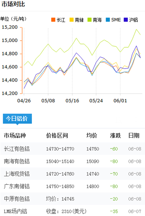 鋁錠價格今日鋁價2018-6-8